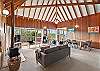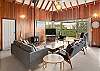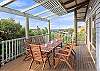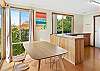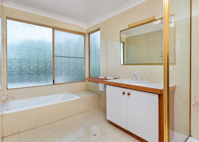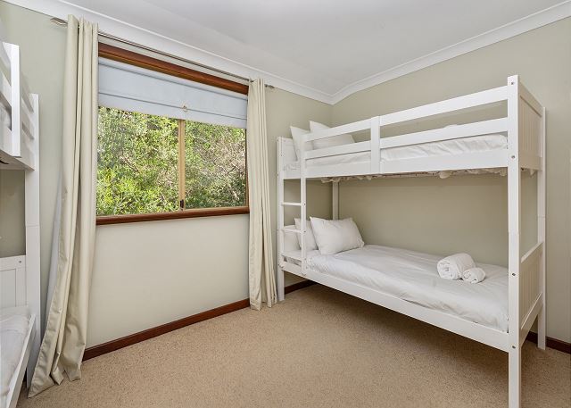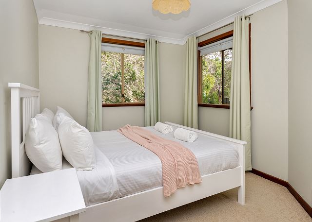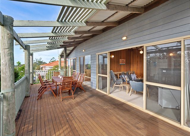 With the entire home on the second level, the main living room is elegant yet comfortable, with ample couches / occasional chairs and a smart TV. The expanse of windows and high raked ceilings creates a light and airy space; with direct access to the fabulous wrap around timber decked balcony with outdoor dining setting and gas BBQ. Boasting sensational bay views which will ensure you enjoy the best of the summer sun whilst you relax and listen to the sounds of the bush, the bird song and whisper of the breeze through the trees.