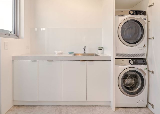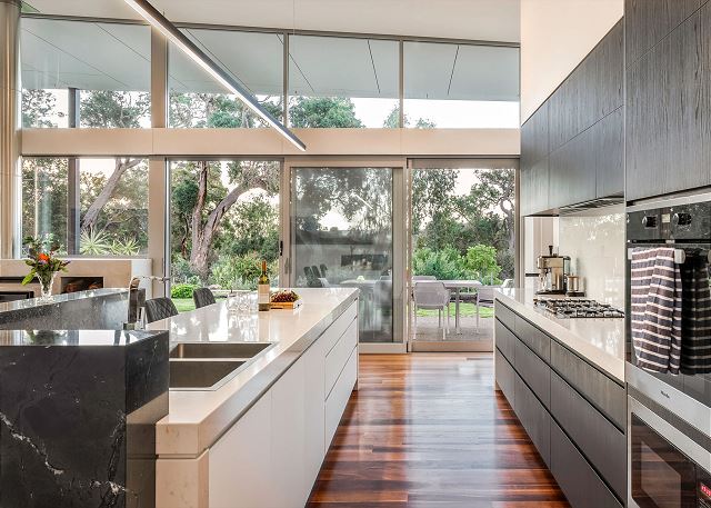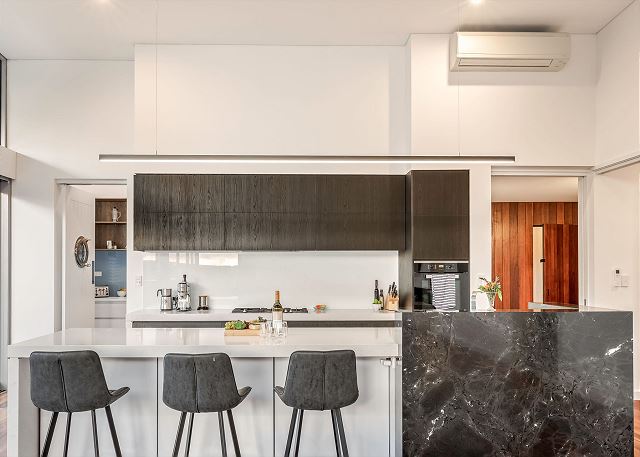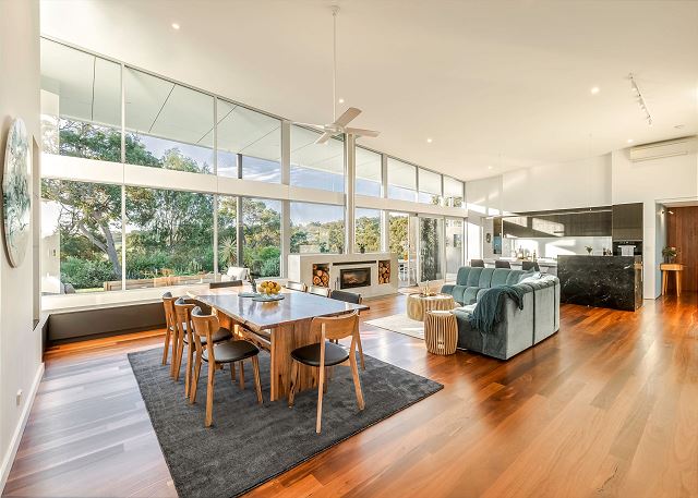 The modern kitchen boasts ample bench space for cooking up a storm and includes all the conveniences of home including a dishwasher, two coffee machines, oven, microwave, Nutri bullet and gas cooktop. The scullery provides another sink, a fridge/freezer and large walk-in pantry. Beautiful jarrah flooring flows throughout the kitchen, living and dining areas and an a/c unit is provided for climate control.