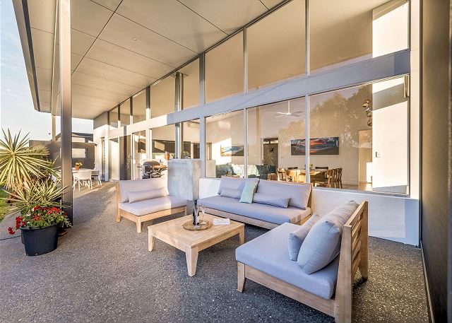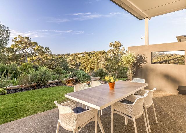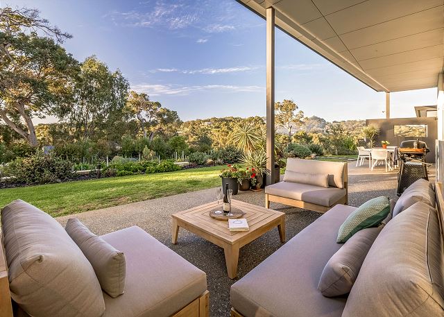 The expansive outdoor alfresco wraps around the rear of the property, with stunning views to soak in from all angles. An 8-seater outdoor dining setting and gas BBQ is the perfect spot for sundowners, while the lounge suite is a relaxing spot to unwind with a glass of local wine.