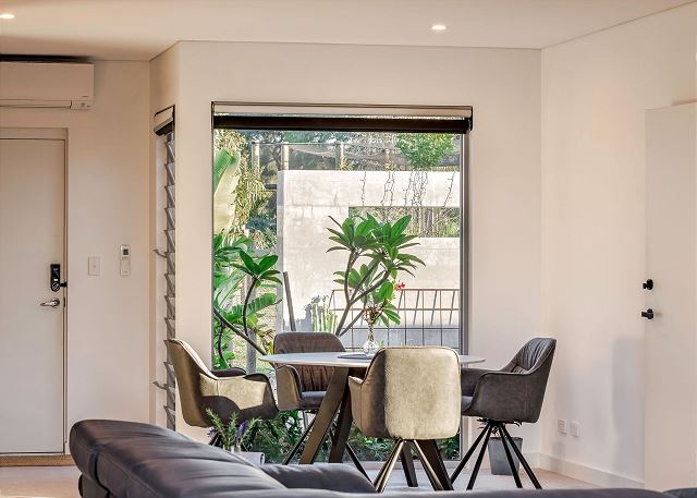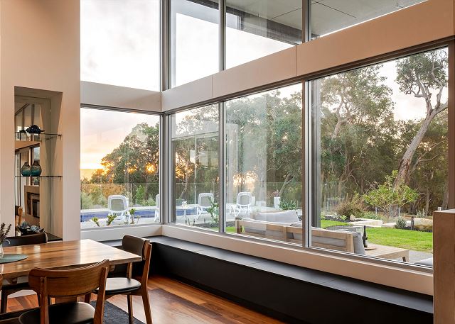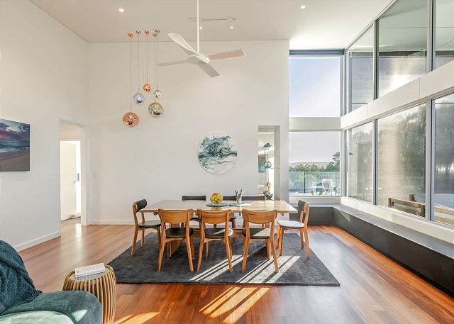 The 8-seater dining table is perfect for family dinners inside cooled by the ceiling fans and perfectly situated to take in the beautiful bushland views that surround the property.