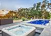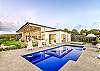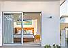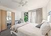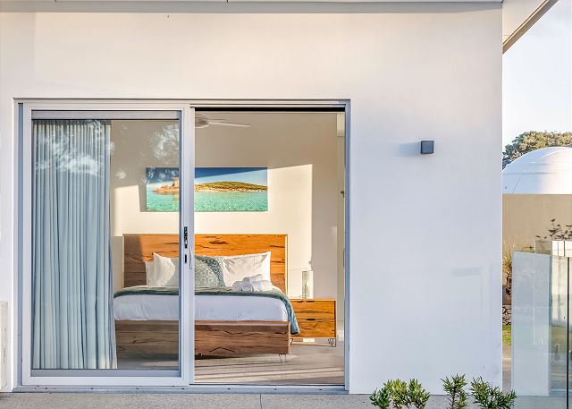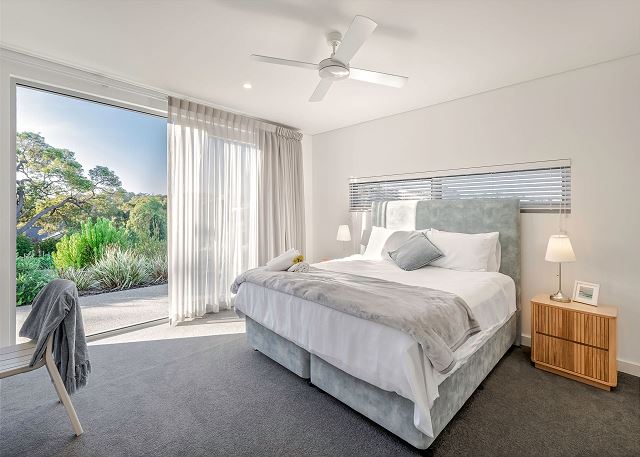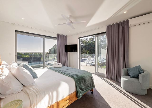 Main bedroom features a king bed, ceiling fan, a/c, TV and ensuite with a shower, large bath and w/c. Glass sliding doors provide direct access to the alfresco and beyond to the pool.