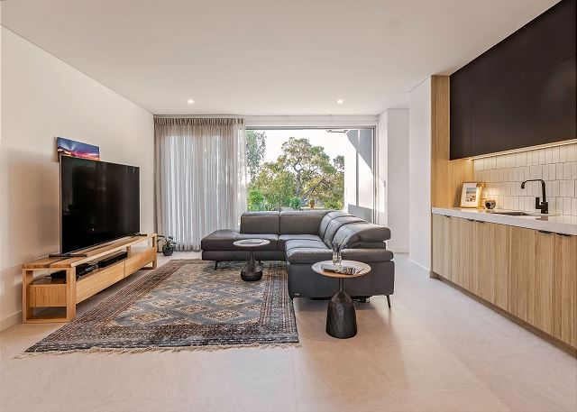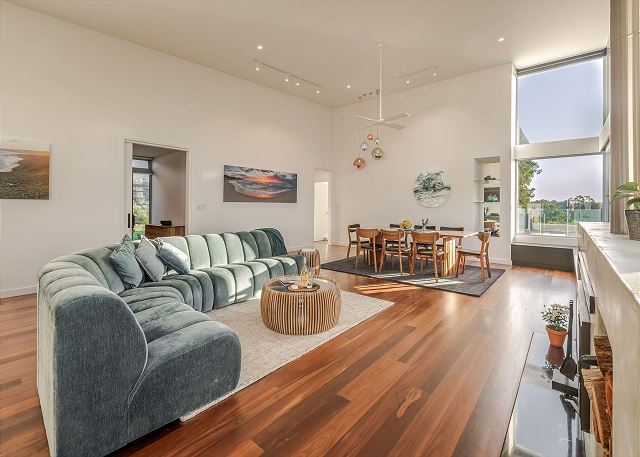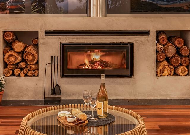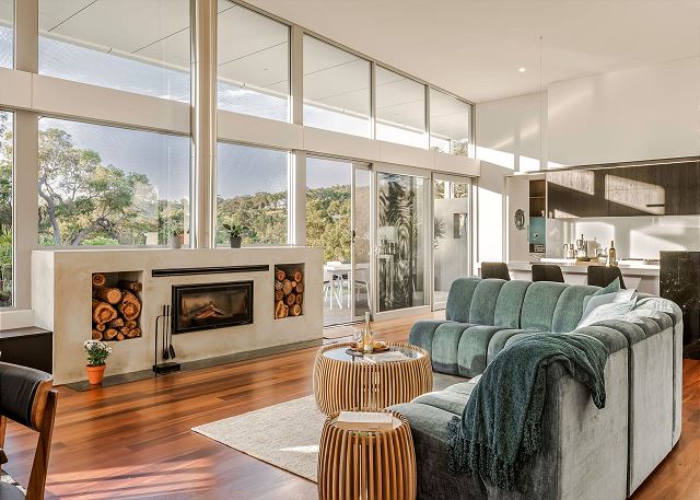 The central living zone is thoughtfully positioned to take in the beautiful surrounding bushland views. Offering a large couch to relax and unwind and a luxurious wood fireplace for those cooler winter evenings.