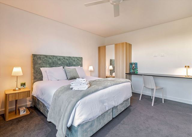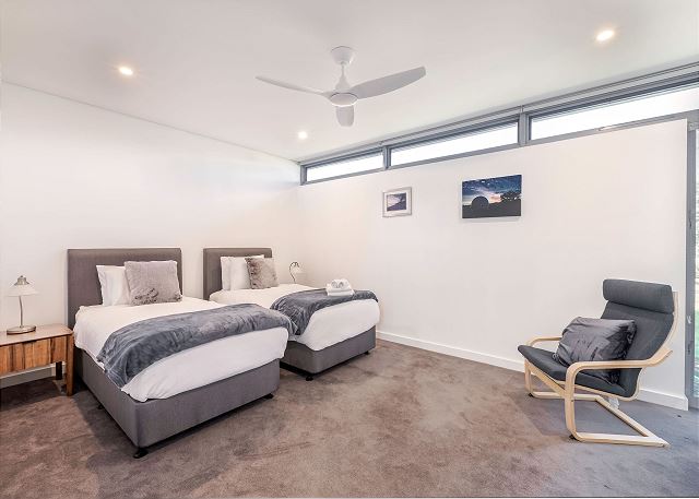 Bed 2. 2 King single beds, ceiling fan (can be configured as a king bed on request) *** PLEASE NOTE: Guests staying in this room will be required to utilise the showers in Beds 1, 3 & 4. A w/c is accessible in the powder room located off the laundry.