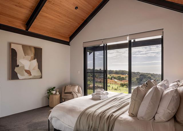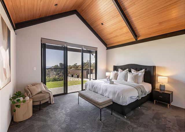 Main bedroom is situated in its own wing of the home and features a king bed, walk in robe and ensuite with a double shower and w/c. Glass sliding doors provide direct outdoor access and gorgeous valley and ocean views.