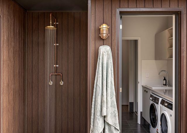 Outdoor shower for convenience after a day exploring the beaches in the region.