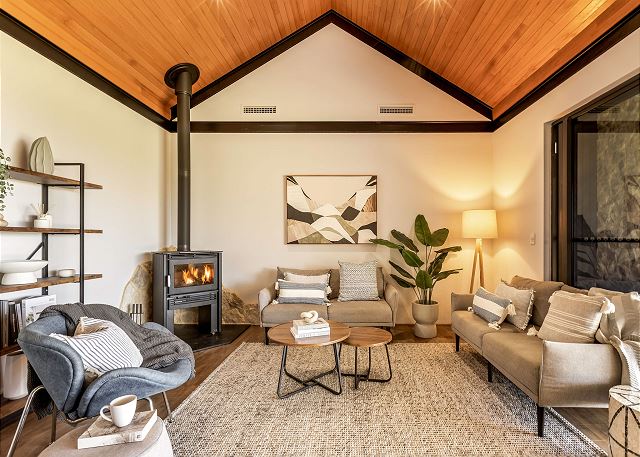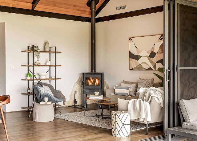 Living area offers cosy wood fireplace and couch; a brilliant spot to unwind with a good book. Ducted air-conditioning throughout the home allows for year-round climate control.
