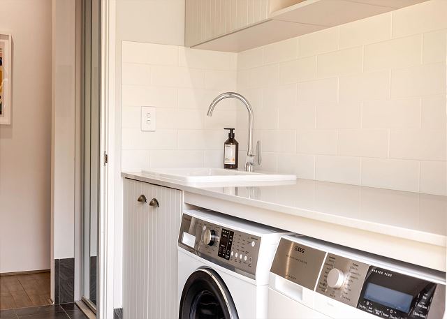 Functional laundry offers washing machine and dryer.