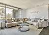 Living zone offers expansive couch and smart TV, with gas fireplace.