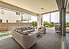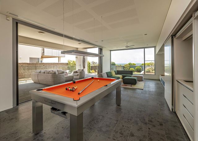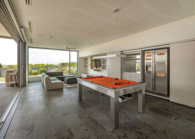 Games zone boasts a large space to relax or play, with a pool table, multiple couches, smart TV, and kitchenette with double door fridge. Leads directly out to the outdoor patio and plunge pool.