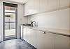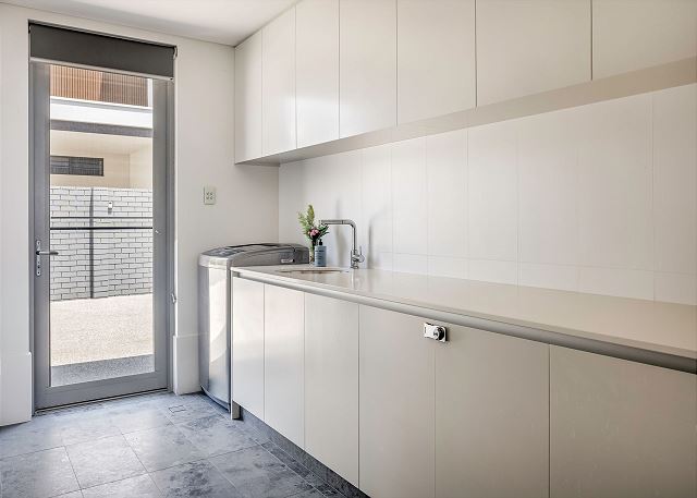 Large functional laundry includes washing machine, ironing facilities, bench space and sink with clothes dryer in the garage.