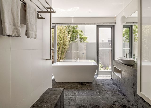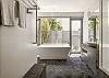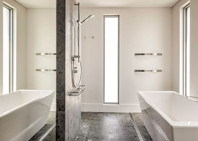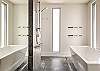 Main bathroom downstairs offers freestanding bathtub, frameless shower and w/c.